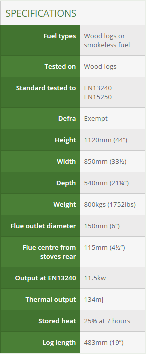 With an output of 11.5kw and high heat retention properties after the fire has gone out, the Ecco E850 will gently warm the area of a 4 to 5 bedroom house with up to 14 rooms or so to a maximum of 280m2 without over heating the room within in the Ecco E850 stands.